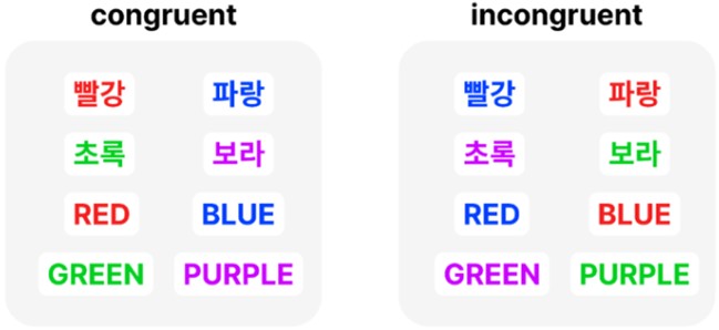 본 연구의 실험 과제는 HUD의 네 위치 중 한 곳에 제시되는 스투룹(Stroop) 자극에 대해 단어 의미와 글자 색이 일치하는지 여부(일치/불일치)를 판단하여 반응하도록 하는 것이었다(Figure 2). 스트룹 자극은 단어 의미와 글자 색 간의 불일치로 인한 간섭 효과를 유발하며, 이를 통해 선택적 주의 및 간섭 억제(억제 통제) 능력을 평가하는 데 사용된다. 이중과업 상황에서 스트룹 간섭에 따른 반응시간 및 정확도 변화는 주의 자원 분배와 인지부하 수준을 민감하게 반영하는 것으로 알려져 있으며, 주행 환경 또는 운전 시뮬레이터에서 2차 과업 부하와 주의 분산 효과를 평가하는 도구로도 광범위하게 활용되어 왔다. 각 자극은 단어 의미와 글자 색상이 일치(congruent)하거나 불일치(incongruent)하도록 조합되었으며, 피실험자는 각 시행(trial)에서 제시된 자극의 일치성을 가능한 빠르고 정확하게 분류하도록 요구되었다. 이와 같은 스트룹 과제는 의미 처리와 색 처리 간 충돌 여부에 따른 인지 간섭을 유발하므로, 두 조건 간 반응시간/정확도 차이를 스트룹 간섭(인지통제 요구) 지표로 해석할 수 있다. 각 자극의 글자 색상은 표준 하이퍼텍스트 마크업 언어(HyperText Markup Language, HTML) 색상 코드(hex code)를 사용해 정의하였으며, 폰트 크기는 32픽셀(px), 굵기는 볼드(bold)로 설정하여 시인성을 확보하였다. 자극은 실제 HUD와 유사한 중첩 효과를 내기 위해 반투명 흰색 박스 안에 제시하였다.
