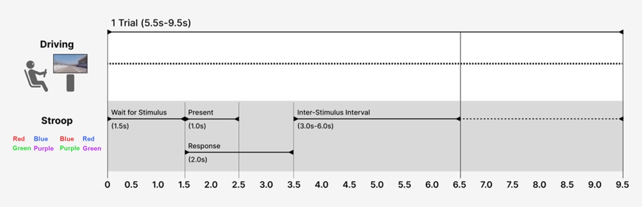 본 실험은 다음과 같은 절차로 진행되었다. 실험 전, 피실험자에게는 충분한 수면과 카페인 섭취 자제를 사전 안내하였다. 피실험자는 실험 장소에 도착한 후, 실험 목적 및 절차에 대한 설명을 듣고 서면 동의서를 작성하였다. 이후 운전 시뮬레이터에 익숙해지도록 10분간 적응 운전을 수행하였으며, 이 과정은 초기 멀미 증상을 완화하기 위한 목적을 포함한다. 적응 후에는 사전 설문지를 작성하고, 3분간 휴식을 취한 뒤 본 실험을 수행하였다. 스트룹 과제 수행 중 피실험자는 HUD에 제시되는 단어의 의미와 글자 색상이 일치하는지 여부를 판단하여 오른손(일치) 또는 왼손(불일치) 버튼으로 응답하였다. 모든 위치 조건에서 자극은 동일한 규칙으로 무작위 제시되었으며, 피실험자는 가능한 빠르고 정확하게 반응하도록 안내 받았다. 실험 종료 후에는 사후 설문을 작성하고, 실험을 종료하였다.