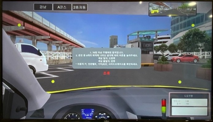 본 실험에서는 실제 차량과 유사한 환경의 운전 시뮬레이터를 사용하였다(Figure 1). 시뮬레이터는 시트, 핸들, 페달, 계기판 등 기본 조작 장치로 구성되었으며, 시트는 참가자의 체형에 맞게 조정할 수 있다. 시뮬레이터는 해상도 1,920×1,080 픽셀의 43인치 디스플레이 3대를 가로로 배열해 총 2,904×569mm의 시야를 제공하였다. 화면에는 도로, 차량, 미러, HUD UI 자극 등 운전 환경이 표시되었으며, 주행 코스는 한국도로교통공단의 실제 운전면허 시험 도로(강남 A · B, 강서 A)를 기반으로 구현하였다. 또한 신호등, 다른 차량 등의 교통 요소를 포함해 실제와 유사한 환경을 재현하였다.