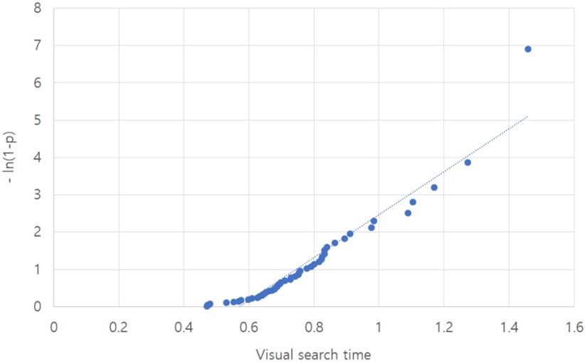 시각적 품질검사는 인간공학 연구 분야에서 항공기 검사, 철판검사, PCB 검사 등 다양한 제품을 검사할 때 인간의 시각적 검사능력과 오류를 연구하였다(Drury, 1975). 시각적 품질검사 시간의 평균값은 일반적인 산술평균을 사용하지 않고, 기하평균탐색시간(GMST: Geometric mean search time)을 사용해 왔다. Monk (1976)에 의해 제안된 GMST는 변형된 지수분포의 평균치를 의미한다. 이후에 시각적 품질검사를 연구하는 많은 연구자들은 GMST를 시각탐색 시간의 평균값으로 사용해 왔다(Chan and So, 2007; Drury and Hong, 2000; Gallwey, 2009). 다음은 시각적 품질검사 시간의 변형된 지수분포와 평균값을 도출하는 과정의 사례다.