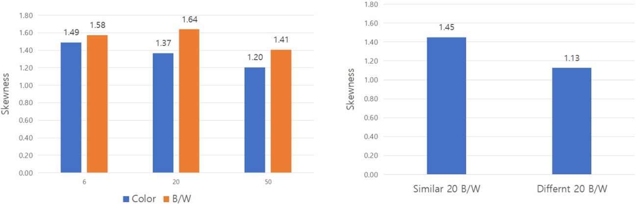 다음으로 세가지 분포의 평균값을 사용하여 분산분석을 실시하였다. Table 3은 분산분산 결과를 나타낸다. 아이콘의 색상이 칼라인 경우와 흑백인 경우의 비교분석에서 ex-Gaussian 분포를 가정한 평균값은 통계적으로 유의한 차이를 보이지 않았다. 그러나 다른 분포를 가정한 경우는 유의한 차이를 보였다. 이러한 결과는 ex-Gaussian 분포를 가정한 경우에 다른 분포를 가정한 경우와는 다른 분산분석 결과가 도출될 수 있다는 것을 의미한다.