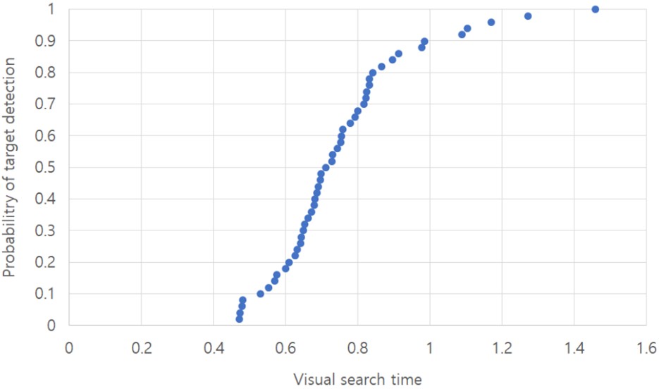 한편, 인간공학 분야에서 1960년대부터 연구되어온 시각탐색작업은 시각적 품질검사작업이다. 제품이나 부품 상에 특정한 결함을 눈으로 탐색하고, 결함을 발견하였을 때 불량품으로 처리하는 작업이다. 특정한 제품에서 결함을 찾는데 소요되는 시간은 우연히 단시간 내에 발견할 수도 있지만, 많은 경우에는 제품(탐색공간)을 여러 번 반복적으로 탐색해야만 제품 상의 결함을 발견할 수 있다. 심지어 어떤 경우에는 결함이 존재함에도 불구하고 발견을 하지 못하는 경우도 있다. 시각적 품질검사 연구에서 반응 시간의 분포는 변형된 지수분포 형태로 가정하였으며, 대표 값으로 산술평균 대신에 기하평균탐색시간(GMST: Geometric Mean Search Time)을 사용해왔다(Morawski et al., 1980; Drury and Watson, 2002; Lee and Hong, 2011).
