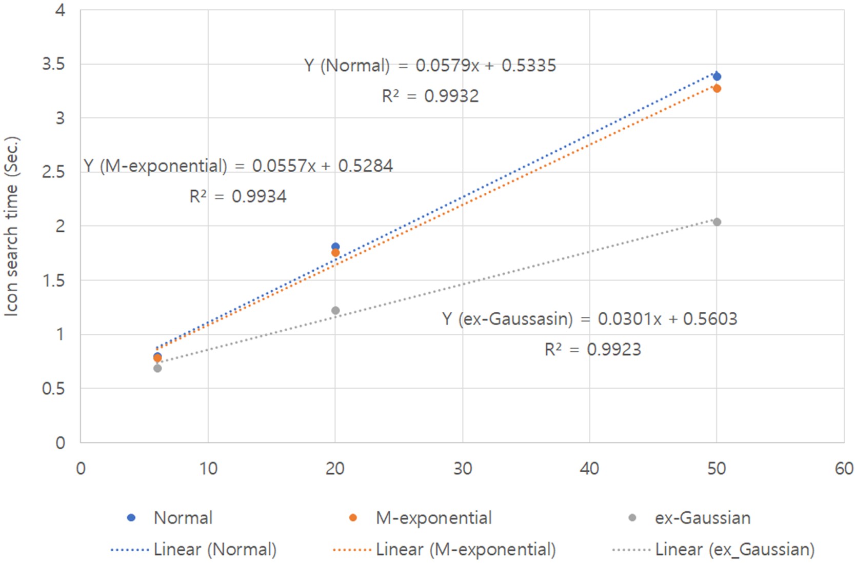 세가지 확률분포의 가정하에서 각 실험조건에서 아이콘 탐색시간의 기대치(평균치)들을 계산하였다. 먼저 이 평균값들을 사용하여 배경 아이콘 수의 증가에 따른 아이콘 탐색시간의 변화를 살펴보았다. 배경 아이콘의 수의 증가하면서 표적 아이콘 탐색시간의 평균치는 일정한 비율로 증가하였다. 이런 경향은 세가지 평균치 모두에서 나타났다. 수식(7)은 정규분포를 가정했을 때의 표적 아이콘 탐색시간의 변화를 나타내는 선형회귀선이며, 수식(8)과 수식(9)는 변형된 지수분포의 평균치(GMST)의 선형회귀식과 ex-Gaussian 분포의 평균치의 선형회귀식이다. 즉 어떤 확률분포를 가정할지라도 아이콘 탐색시간은 배경 아이콘의 숫자가 증가하면서 일정한 비율로 증가했다. Figure 6은 배경 아이콘 수의 변화에 따른 아이콘 탐색시간의 변화를 나타낸다.