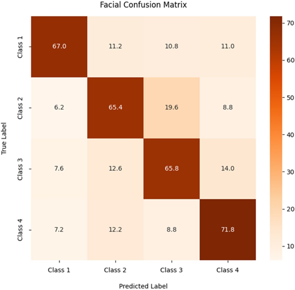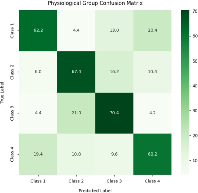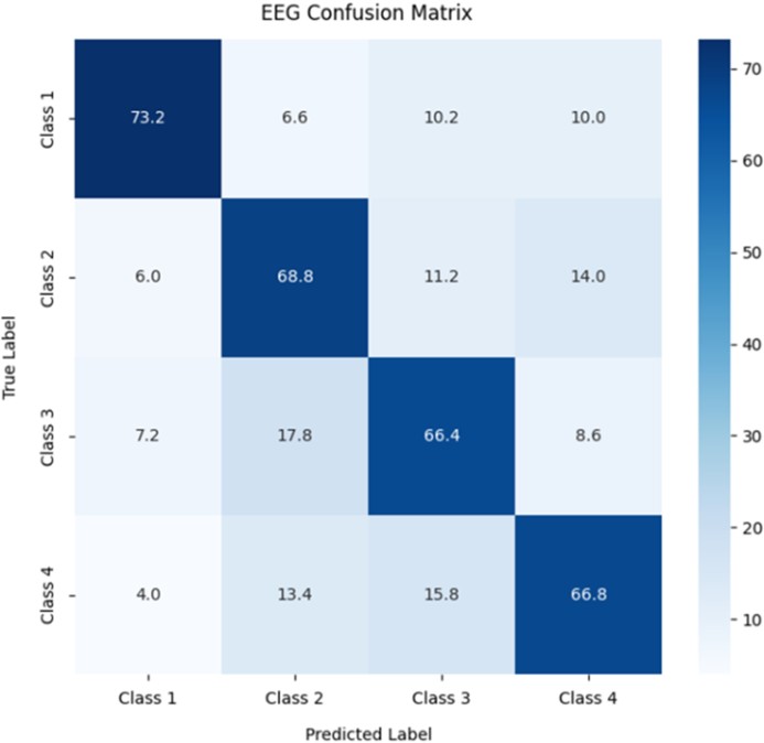 EEG 그룹은 평균 정확도 68.8%로 세 그룹 중 가장 높은 성능을 보였다. 혼동행렬 분석 결과, 네 개 클래스(Class 1-4) 전반에서 균형 잡힌 분류 경향을 보였으며, 특히 Class 1(양의 안정-양의 선호)에서 가장 높은 예측 일치를 보였다. EEG 신호는 사용자의 인지적 안정성과 긍정적 감정 상태를 효과적으로 구분하며, 전반적으로 가장 안정적이고 일관된 분류 성능을 보였다. 또한 EEG 기반 모델은 클래스 간 구분 경향이 뚜렷한 경향을 보인다. 이는 Figure 2에서 확인할 수 있다.