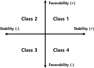 참가자는 제시된 문장을 읽어 음성 명령을 수행한 뒤, VUI 시스템이 제공하는 음성 응답을 듣고 3초간의 대기 시간을 가진 후 9개의 형용사 쌍으로 이루어진 7점 척도 설문을 매 트라이얼마다 self-report 방식으로 응답하였다(예: Unstable-Stable, Hard to Understand-Easy to Understand, Uncertain-Certain 등). 이 설문 점수들은 Kansei 공학 기반 요인분석(Factor analysis)을 통해 고유값(Eigenvalue)이 1 이상인 것을 기반으로 두 개의 감성 요인으로 축소되었다. 연구진은 요인부하량(Factor loading)을 기반으로 두 요인에 참가자의 반응이 얼마나 안정적인가(안정성, Stability), 얼마나 마음에 들었는가(선호도, Favorability)로 명명하였다. 안정성은 시스템 응답에 대한 예측 가능성과 신뢰성, 선호도는 사용자가 응답에 대해 느끼는 호감도 및 상호작용의 긍정적 인상을 의미한다. Figure 1은 도출된 안정성과 선호도에 따라 4가지 클레스를 할당한 것이다. 사분면은 해당 데이터셋에서 도출한 안정성과 선호도를 음수, 양수로 구분하여 나눈 것이다. Class 1은 양의 안정-양의 선호 상태를 나타내고 Class 3은 음의 안정-음의 선호 상태를 나타낸다. 각 클레스의 트라이얼 데이터 수는 Table 1과 같다.