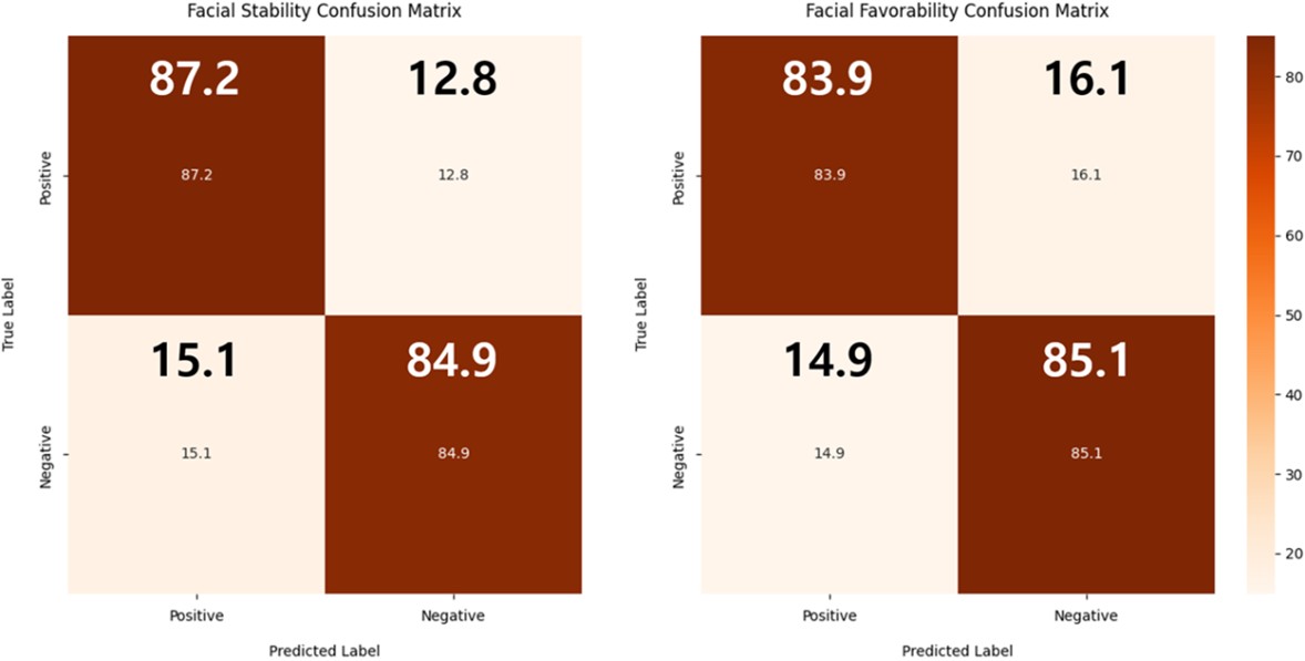 Facial 그룹 이진 분류 결과는 Figure 7에서 볼 수 있다. 안정성 분류에서는 Balanced Accuracy 86.1%, F1-score 86.2%로 높은 성능을 보였으며, 선호도 분류에서는 Balanced Accuracy 84.5%, F1-score 84.4%를 기록하였다. 이진 분류 문제에서 Facial 그룹은 Physiological 그룹보다 다소 높은 분별력을 보였으며 EEG 그룹과 비슷한 수준의 성능을 보였다.