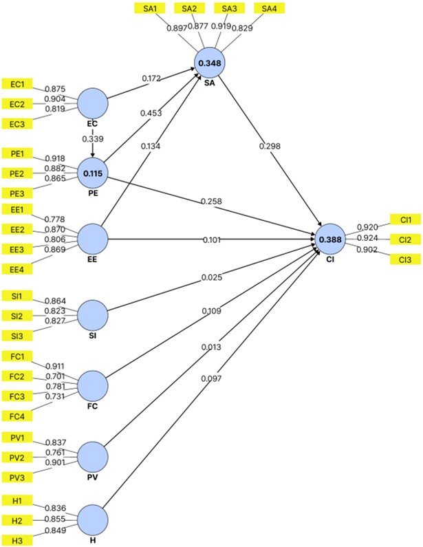 고등교육 맥락의 지속사용 연구에서도 사용 용이성 계열 요인이 만족 및 사용의도와 연계될 수 있음이 보고되었다(Deng et al., 2023; Zheng et al., 2025). 이에 EE가 CI에 영향을 미치는 경로(H2)와 SA에 영향을 미치는 경로(H10)를 설정하였다.