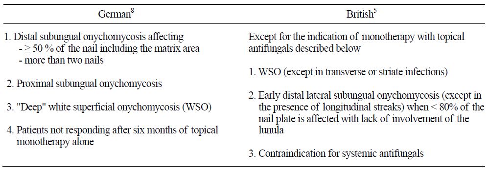 손발톱진균증에서는 전신 항진균제 투여가 치 료의 원칙이다. 경구제의 효과가 국소도포제보다 좋기 때문에 초기병변, 손발톱판 표재성 감염, 경 구제가 금기인 경우를 제외하고는 경구제 투여가 필요하다. 2000년대 유럽가이드라인에서는 국소 도포제의 적응증을 경증 혹은 중등도의 감염(손 발톱판 원위부 50% 이하가 감염)이 손발톱바탕 질 침범없이 3~4개의 손발톱에 국한된 경우에만 국한시켰고 손발톱바탕질이 침범되거나 손발톱판 50%를 넘는 경우는 경구제 치료를 권장하였다[7]. 독일과 영국의 손발톱진균증 치료지침에서는 경 구제 치료의 적응증으로 Figure 1과 같이 제시하고 있다[5],[8],[9].